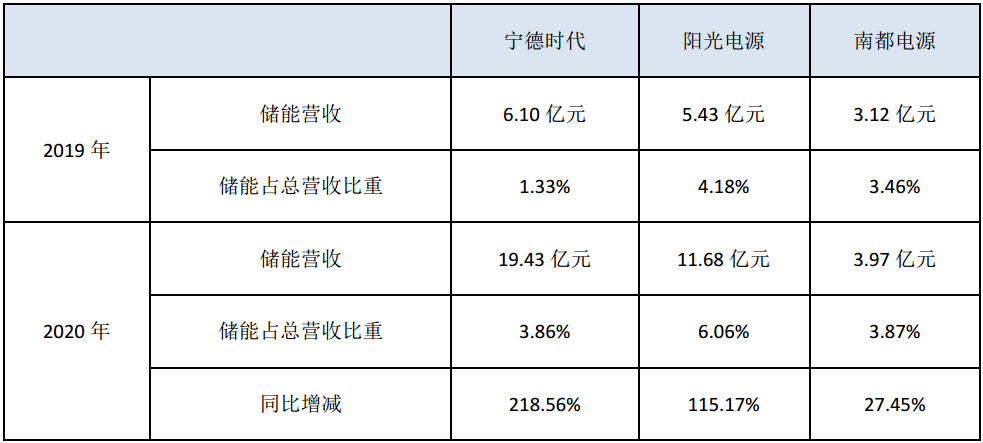 從上表中可以看出,寧德時代、陽光電源與南都電源2020年儲能業(yè)務(wù)營收都有增長,尤其是寧德時代和陽光電源,南都電源增速相對較慢。其中,寧德時代作為動力電池頭部企業(yè),儲能營收增長速度最為明顯,是2019年的3倍以上,陽光電源也的儲能營收也實現(xiàn)了翻一番。