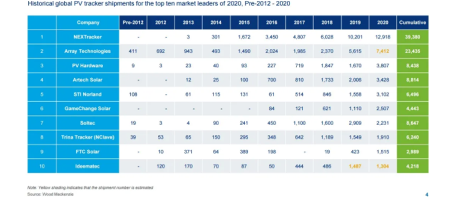 截止2020年十大跟蹤支架廠商出貨量數據 來源:伍德麥肯茲
