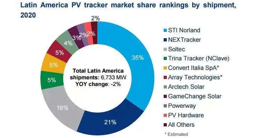 2020年,拉丁美洲市場跟蹤支架出貨6.73GW,雖然巴西和智利都有不同程度的增長,但是整個地區與上一年相比僅增長2%。STI Norland公司的出貨占比明顯增長。從上一年的17%提高到了35%,穩居該市場第一位。NEXTracker 和Soltec則分別排在第二和第三。