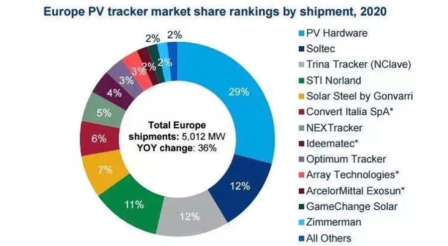 2020年歐洲地區的出貨量占全球的11%,達到了5GW。與2019年相比,市場更加分散和多元化。PV Hardware以29%的市場份額占據了頭部位置。Soltec和Trina Tracker則以微小的差距分別排在了第二和第三。