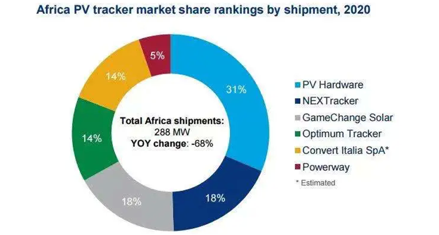 非洲市場與上一年相比,光伏跟蹤支架出貨量下降68%,疫情爆發導致經濟下行,是市場下滑的主要原因之一。PV Hardware作為市場領導者,雖然自2019年開始占比大幅下降,但是2020年該公司依舊占據了31%的市場份額。NEXTracker 和GameChange Solar的市場占有率則有明顯了增長。