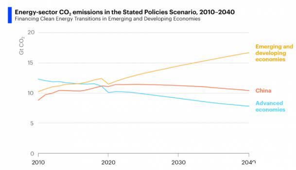 未來幾十年,除非采取更強有力的行動來改造能源系統,新興經濟體和發展中經濟體將占全球排放增長的大部分。除中東和東歐部分地區外,這些國家的人均排放量是世界上最低的,是發達經濟體水平的四分之一。但是,根據現有政策的情景中,新興經濟體和發展中經濟體的碳排放預計在未來20年將增長50億噸。相比之下,發達經濟體的碳排放預計將下降20億噸,而中國的碳排放將趨于平穩。