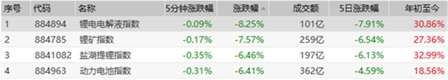汽車、鋰電池等板塊16日再遭重挫,鋰電相關指數普跌,鋰電電解液指數領跌8.25%,鋰礦指數大跌7.75%,鹽湖提鋰和動力電池指數下跌超6%,從近五日的漲跌幅看來,呈持續下跌的趨勢。