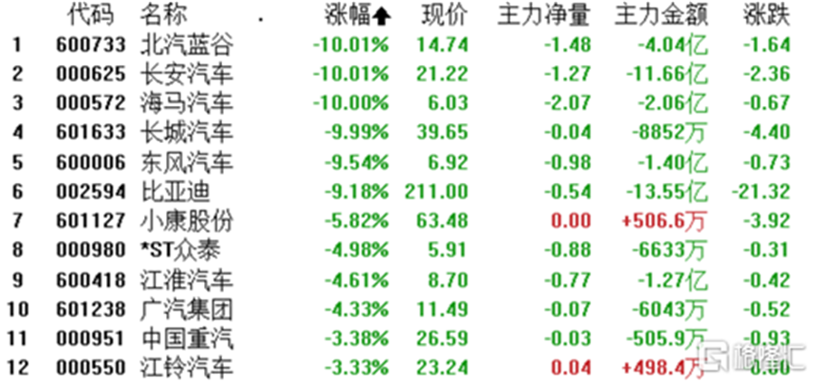 汽車板塊跌幅也進一步擴大,北汽藍谷、長安汽車、海馬汽車、長城汽車跌停,東風汽車、比亞迪暴跌超9%,小康股份、江淮汽車、廣汽集團等股價紛紛下挫。