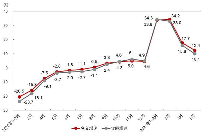 消費市場恢復態勢較好。5月份,社會消費品零售總額同比增長12.4%,主要受同期基數變動因素影響,增速比4月份回落5.3個百分點。與2019年同期相比,社會消費品零售總額增長9.3%,增速比4月份加快0.5個百分點;從環比看,5月份社會消費品零售總額環比增長0.81%,增速比上月加快0.56個百分點。1—5月份,社會消費品零售總額同比增長25.7%;兩年平均增長4.3%,比1—4月份提高0.1個百分點。
