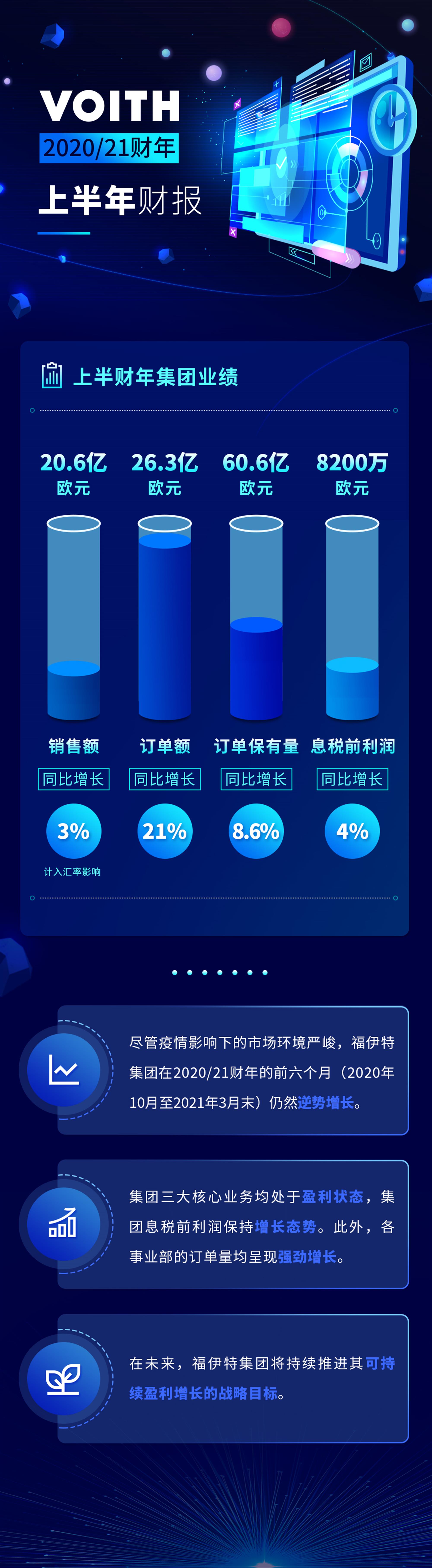 在本財年上半年,集團取得了20.6億歐元的銷售額,略低于去年同期的20.8億歐元。在計入匯率影響后,銷售額比去年同期增長3%。訂單額大幅增長21%,達到26.3億歐元(去年同期為21.7億歐元)。截至3月31日,訂單保有量達到60.6億歐元,在去年同期55.8億歐元的高位水平上再次強勢增長,創九年來的最高紀錄。此外,福伊特在上半財年經營業績小幅上揚,息稅前利潤達8200萬歐元,同比增長4%。在受全球疫情影響的大環境下,福伊特2020/21財年上半年表現亮眼。盡管環境充滿挑戰,凈利潤表現良好。