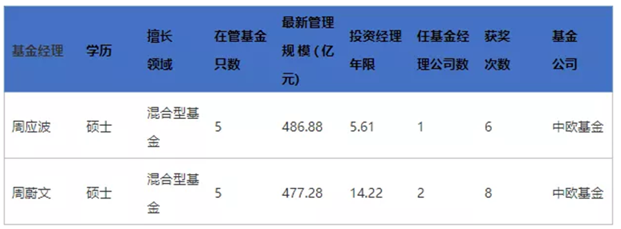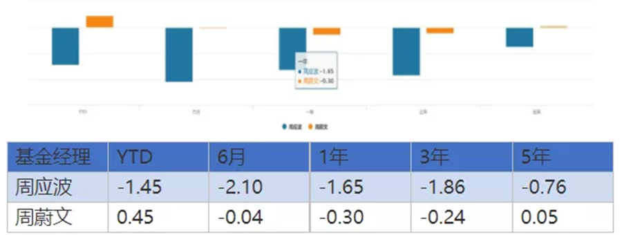 目前周蔚文和周應波在管基金數量均為5只,并且管理規模也十分接近,周蔚文的管理規模為477.28億元,周應波的管理規模為486.88億元。