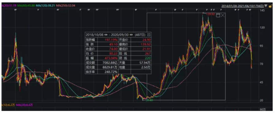 作為鋰電材料的龍頭,贛鋒鋰業(002460.SZ)的市值從2010年8月10日上市以來的59億元抬升至如今的1400億元,期間經歷了幾波上漲。到了2021年1月25日,股價更是達到歷史最高點149.3元/股。但隨后,贛鋒鋰業經歷了長達兩個月左右的回調,直到6月才反彈至前期高點附近。