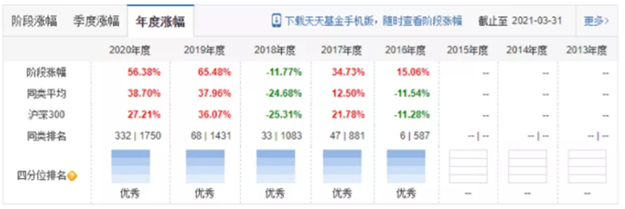 雖然成立的時間點比較尷尬,但在2016年,周應波仍然取得了15.06%的正收益,成立至今(截止到2021年6月9日)基金獲得了323.98%的累計收益,在同期同類基金排名中位居第三,僅次于趙蓓的“工銀前沿醫療”和蕭楠的“易方達消費行業”。出色的業績使基金規模從成立之初的2000多萬元增長到如今的214億元。