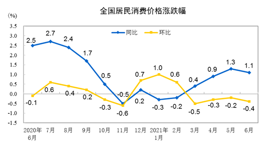 2021年6月份,全國居民消費(fèi)價格同比上漲1.1%。其中,城市上漲1.2%,農(nóng)村上漲0.7%;食品價格下降1.7%,非食品價格上漲1.7%;消費(fèi)品價格上漲1.1%,服務(wù)價格上漲1.0%。上半年,全國居民消費(fèi)價格比去年同期上漲0.5%。