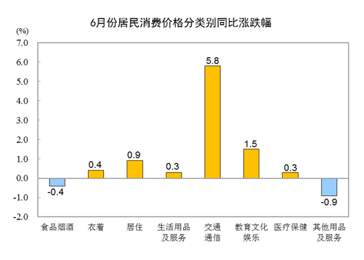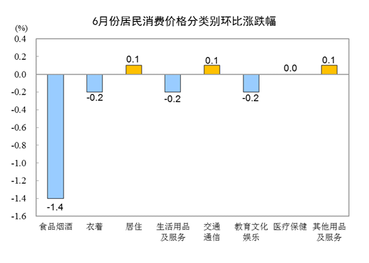 6月份,全國居民消費(fèi)價格環(huán)比下降0.4%。其中,城市下降0.4%,農(nóng)村下降0.5%;食品價格下降2.2%,非食品價格持平;消費(fèi)品價格下降0.6%,服務(wù)價格下降0.1%。