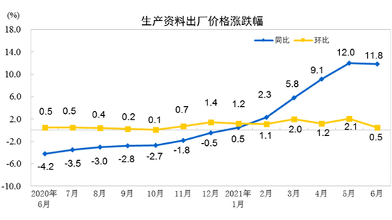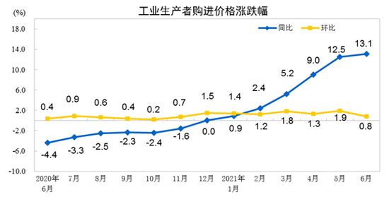 2021年6月份,全國工業(yè)生產(chǎn)者出廠價格同比上漲8.8%,環(huán)比上漲0.3%;工業(yè)生產(chǎn)者購進(jìn)價格同比上漲13.1%,環(huán)比上漲0.8%。上半年,工業(yè)生產(chǎn)者出廠價格比去年同期上漲5.1%,工業(yè)生產(chǎn)者購進(jìn)價格上漲7.1%。