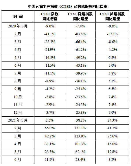 2021年6月,CTSI指數為171.9點,同比增長11.7%,比2019年同期下降1.2%。分結構看,CTSI貨運指數為200.5點,同比增長8.2%,比2019年同期增長13.7%,兩年增幅與5月持平;CTSI客運指數為119.2點,同比增長23.4%,比2019年同期下降29.8%,兩年降幅較5月出現擴大。