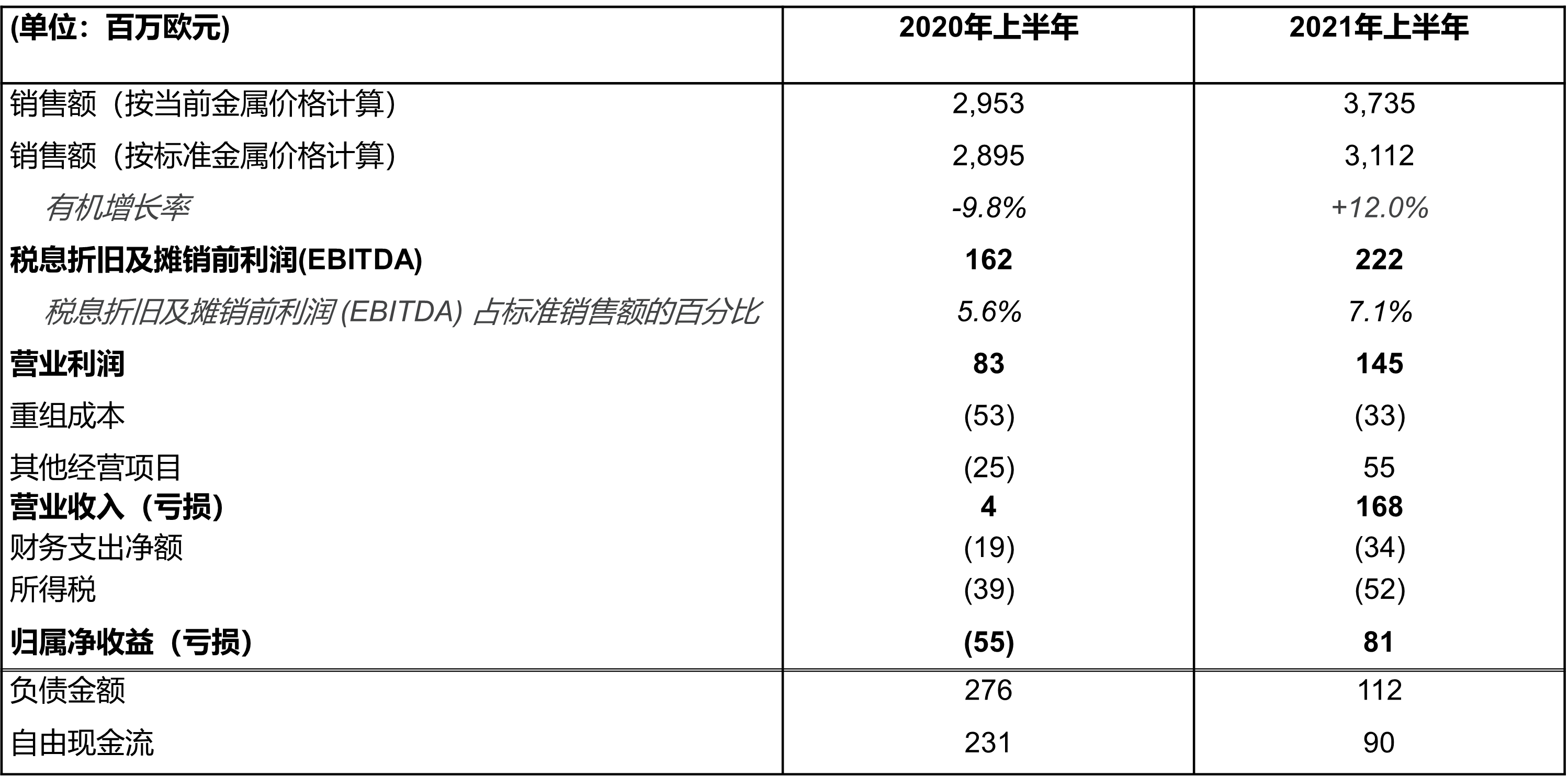 2021年上半年,按標準金屬價格計算的銷售額達31.12億歐元,與上年同期相比實現內生增長12%,其中第二季度同比增長24.2%,反映了需求回升及有效的產品組合和價格管理。
