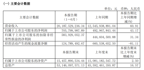 8月24日,天合光能(688599)發布2021年半年度報告。報告顯示,今年上半年,公司營業收入201.88億元,同比增長60.91%;歸股凈利潤7.06億元,同比增長43.17%,扣非凈利潤5.84億元,同比增長31.34%?;久抗墒找?.34元,同比增長21.43%。