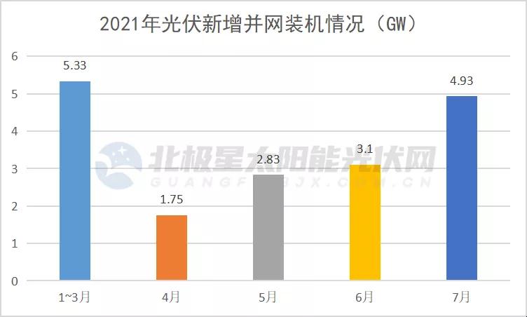 國家能源局1-7月份全國電力工業(yè)統(tǒng)計數(shù)據(jù)顯示,1~7月全國太陽能發(fā)電新增裝機17.94GW,除去前六月數(shù)據(jù),則7月新增裝機達到4.93GW,遠超前6個月的單月數(shù)據(jù),光伏終端市場需求大幅度“回暖”。