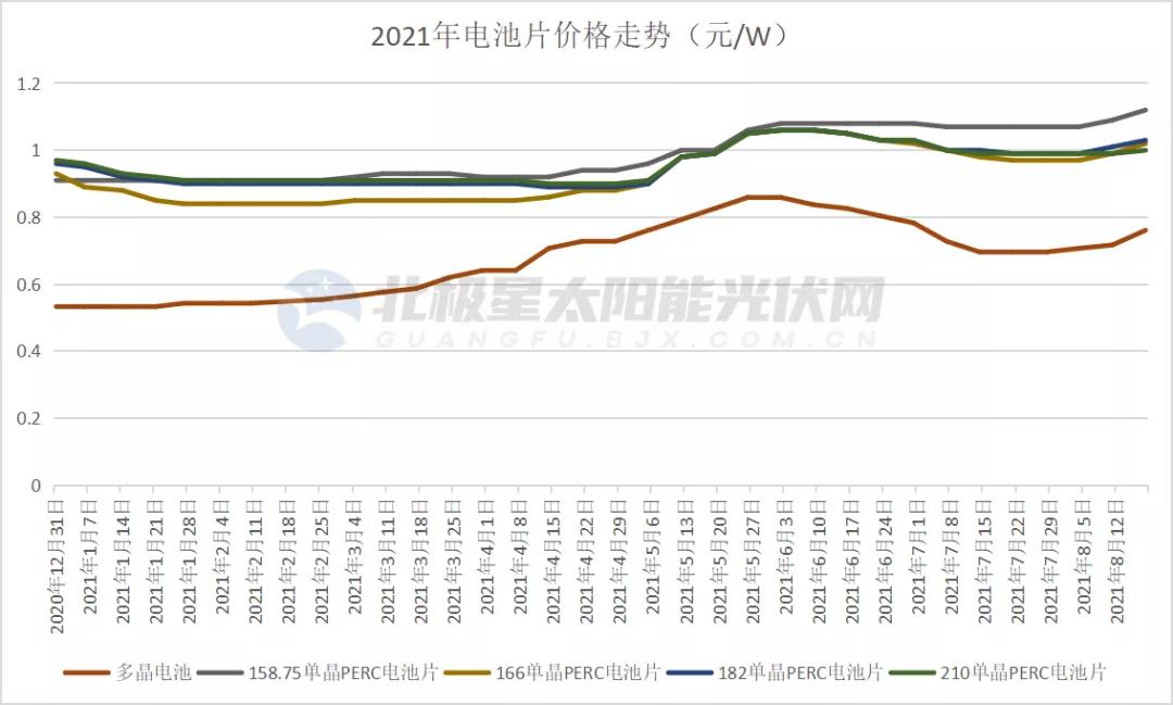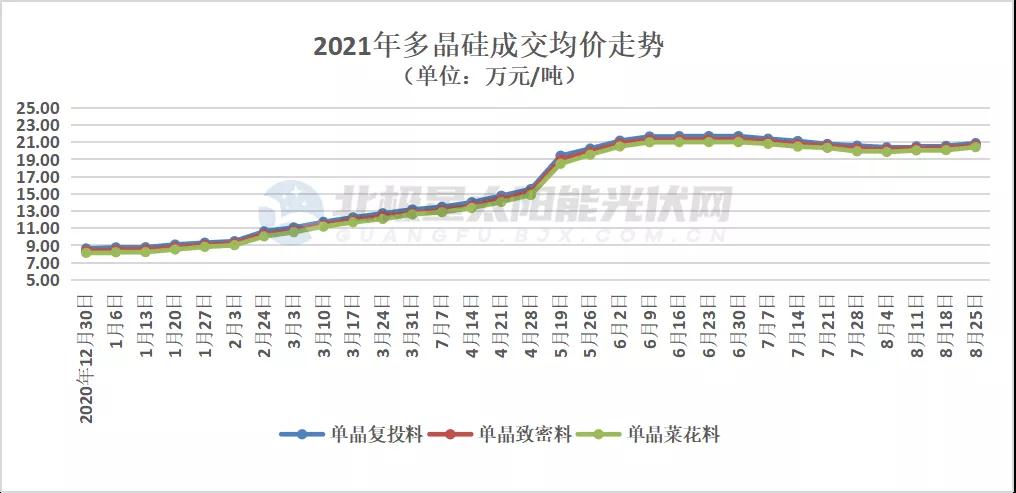 硅料環(huán)節(jié),中國有色金屬協(xié)會硅業(yè)分會數(shù)據(jù)顯示,2021年初至6月中旬,單晶復投料、單晶致密料、單晶菜花料價格分別飆漲151%、154%、159%,6月下旬至8月初,價格連續(xù)維穩(wěn)、下降7周,8月第二周價格再度反彈,截至本周已連漲三周。