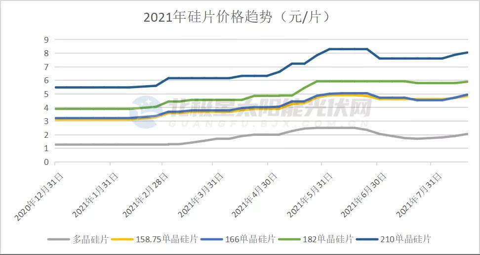 但價格漲勢快速向下傳導,單晶硅片龍頭隆基、中環(huán),電池片龍頭通威太陽能紛紛上調8月報價,最高漲幅達6%。第三方價格分析機構PVInfoLink統(tǒng)計數(shù)據(jù)同樣顯示,8月前三周,單晶硅片、單晶電池片分別最高上漲9%、5%。