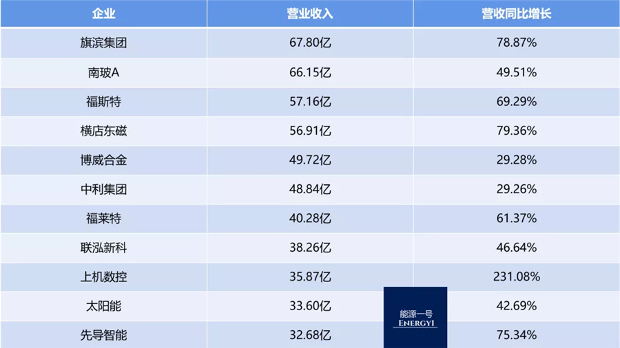 今年上半年中國光伏上市公司A股的財報已經出爐,總計2900多億營收、300余億凈利。其中,營收最高的前十大公司分別是隆基股份、通威股份、特變電工、天合光能、中環股份、正泰電器、晶澳科技、東方日升和陽光電源、三峽能源。營收同比增幅較高的有中環股份、愛旭股份、隆基股份、天合光能、福萊特、上機數控、錦浪科技、海優新材、固德威、奧特維、明冠新材等。