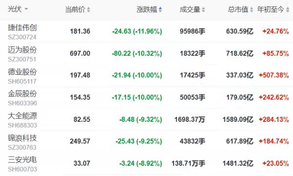 受半年報兌現、產業鏈價格上漲等因素影響,今日A股光伏板塊也出現大面積暴跌。據統計,至午間收盤,德業股份、金辰股份跌停,捷佳偉創、邁為股份跌超10%,大全能源、錦浪科技、三安光電等跌幅較大。