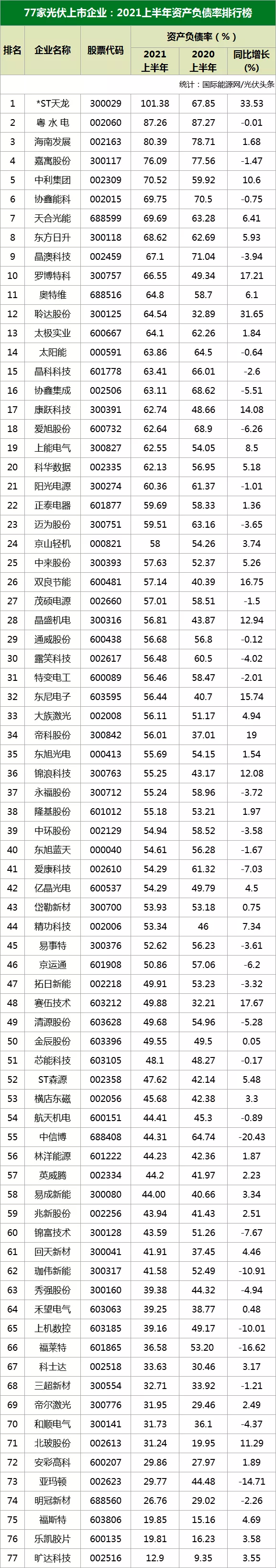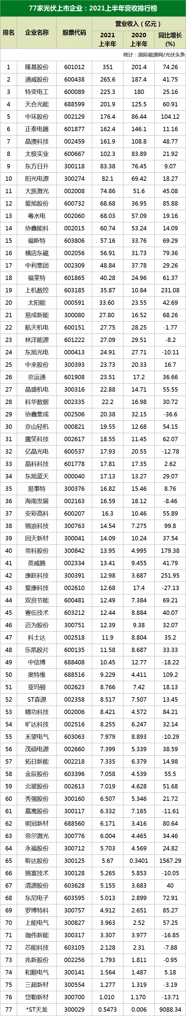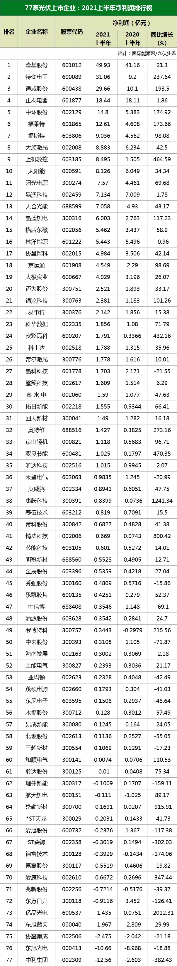 國(guó)際能源網(wǎng)/光伏頭條統(tǒng)計(jì),目前,包括光伏組件供應(yīng)商、光伏逆變器企業(yè)、光伏玻璃企業(yè)、光伏輔料企業(yè)、光伏材料企業(yè)等在內(nèi)的77家光伏上市企業(yè)交出了2021年半年度成績(jī)單。