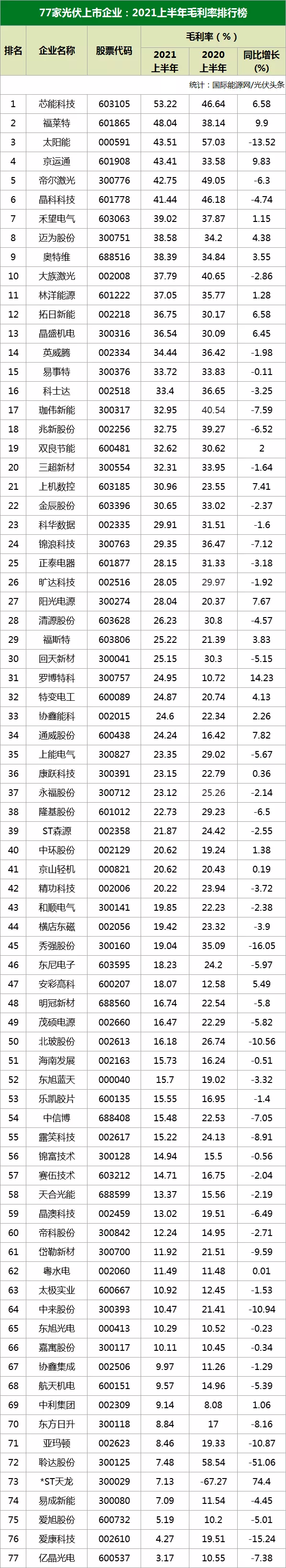 77家光伏企業(yè)毛利率前三:芯能科技(53.22%)、 福萊特(48.04%)、太陽(yáng)能(43.51%)