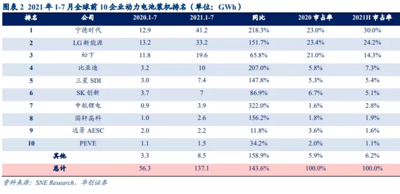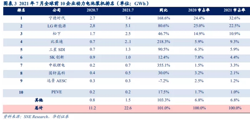 7月,寧德時代、LG、松下依然高高在上,穩(wěn)居前三。比亞迪、SKI、三星SDI、中航鋰電、國軒高科、遠(yuǎn)景AESC、PEVE分列前十,其市占率達(dá)到93.4%。
