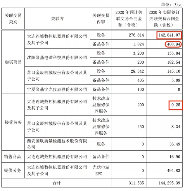 根據(jù)隆基股份2020年財報,其與連城數(shù)控實際簽訂關(guān)聯(lián)交易合同金額(含稅)總計約為14.3億元,預(yù)計關(guān)聯(lián)交易合同金額(含稅)為27.88億元。