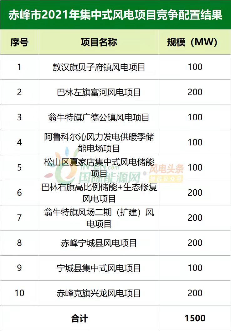 9月17日,內蒙古赤峰市公布2021年集中式風電、集中式光伏發電項目競爭配置優選結果,擬向內蒙古自治區能源局申報的集中式風電項目10個、總規模1.5GW,集中式光伏發電項目5個、總規模500MW。