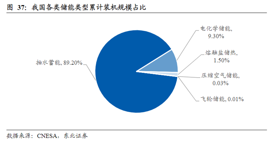 東北證券研究表示,當(dāng)前,在我國各類儲能類型累計(jì)裝機(jī)規(guī)模中,抽水蓄能占比為89.20%;電化學(xué)儲能占比為9.30%;熔融鹽儲熱占比為1.50%;壓縮空氣儲能占比為0.03%;飛輪儲能占比為0.01%。