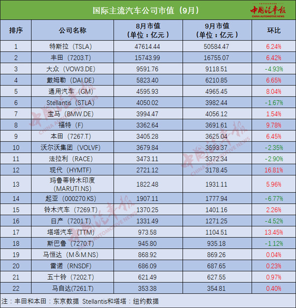 9月,特斯拉、豐田和大眾集團依然是國際車企市值圈的“三巨頭”。