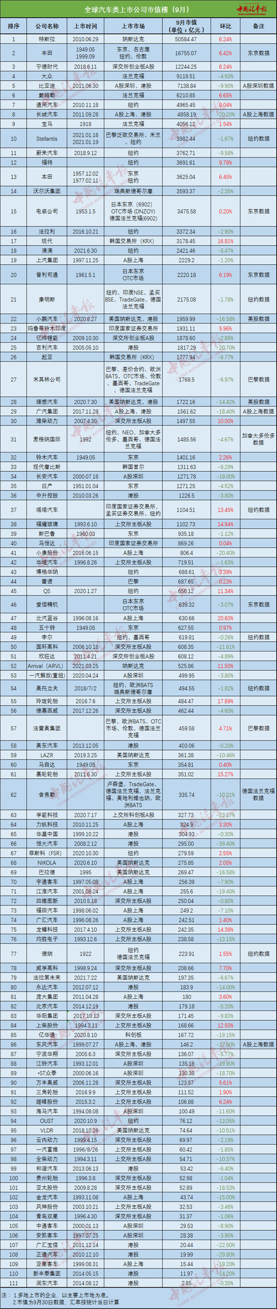 近期,中國汽車報汽車市值研究組在上月首次發布研究報告(8月)的基礎上,繼續對全球汽車類上市公司進行了月度市值變化跟蹤,并針對2021年9月全球汽車產業鏈各細分領域、典型企業的月度市值變化進行梳理和分析。9月的汽車市值統計范圍,依舊涵蓋了國際和國內上市的主流整車、零部件企業,以及國內主要造車新勢力和經銷商集團,共計111家全球汽車類上市公司。