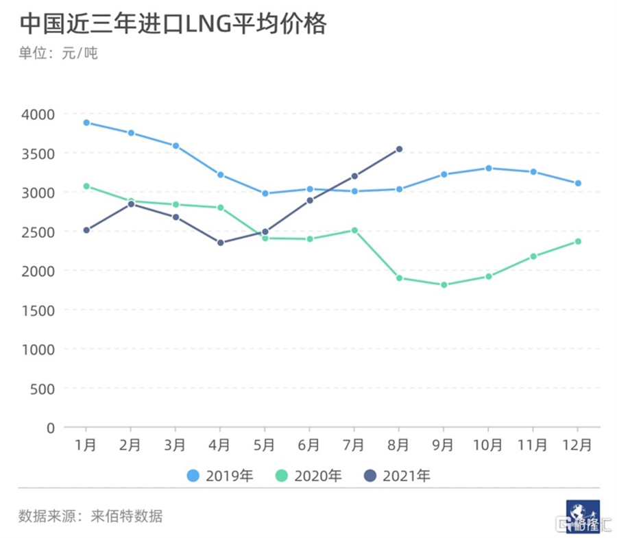 整體來看,今年5月以來進口LNG的平均價格已超過去年同期。此后一路上揚,在7月超過了2019年的同期水平。天然氣咨詢公司來佰特數據統計顯示,8月進口LNG的平均價達到3539元/噸,直逼2019年1月的最高點。