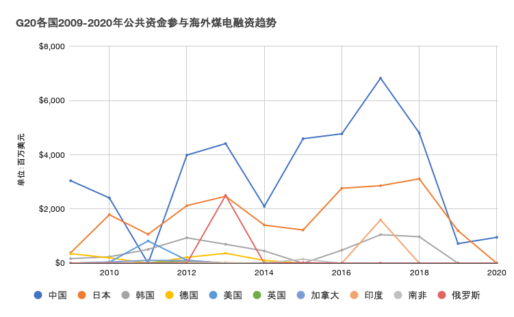 G20各國2009-2020年公共資金參與海外煤電融資趨勢