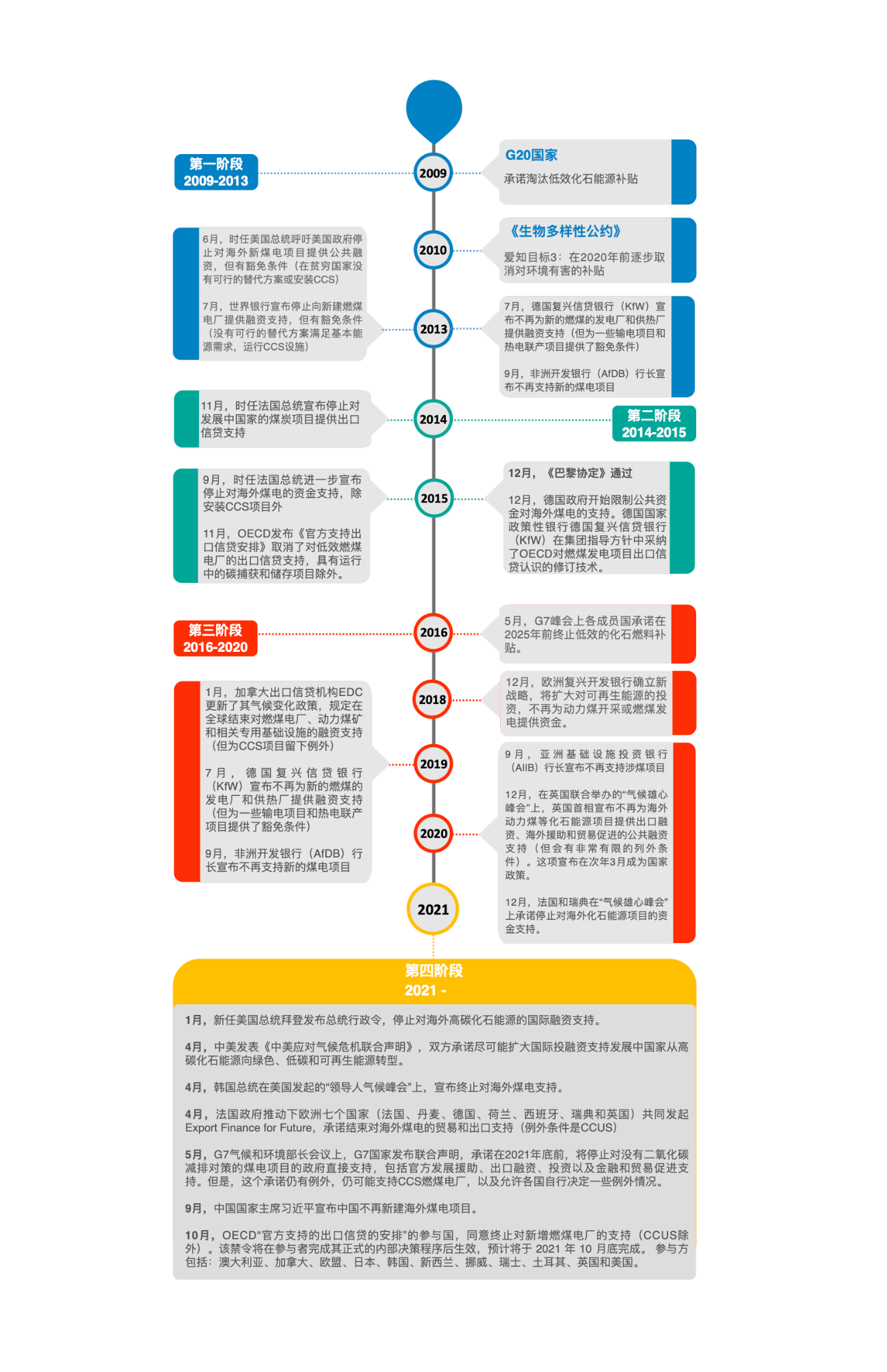 公共資金在海外煤電項目的投資離不開政策指引,2009-2021年,越來越多的國家在氣候變化議題上達成共識,一系列限制煤炭消費的政策、倡議的提出加速了G20成員國的退煤進程。《簡報》根據(jù)公開數(shù)據(jù),梳理了2009-2020年G20國家公共資金在海外煤電投融資的表現(xiàn),在此基礎(chǔ)上分析不同階段的退煤承諾對各國公共資金參與海外煤電投融資的影響。
