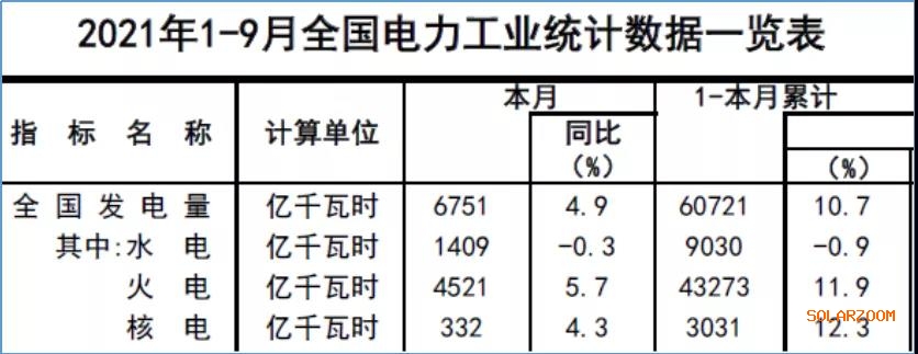 根據(jù)中電聯(lián)和能源局每月發(fā)布的全國電力工業(yè)統(tǒng)計(jì)數(shù)據(jù),2021年1-9月全國發(fā)電量總計(jì)60721億Kwh。該一覽表沒有直接給出風(fēng)電和太陽能的發(fā)電量,但如果從發(fā)電類別來看,假設(shè)生物質(zhì)能、潮汐能等發(fā)電量相對可以忽略,將總發(fā)電量減去水電、火電、核電,那余量就是風(fēng)、光發(fā)電總量。