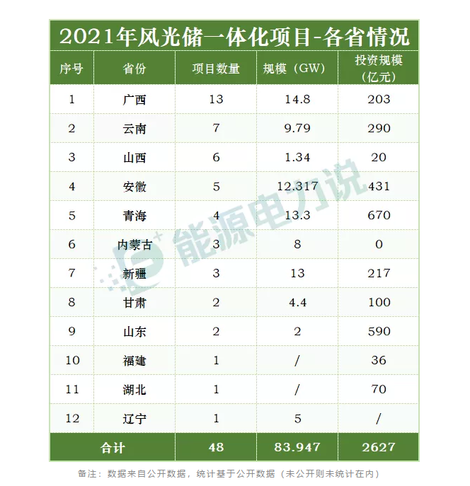 據能源電力說不完全統計,2021年至今全國12省陸續明確風光儲一體化建設項目,共48個,項目進度含項目規劃、簽署戰略合作協議、省能源局印發的多能互補一體化項目建設方案、開工等。