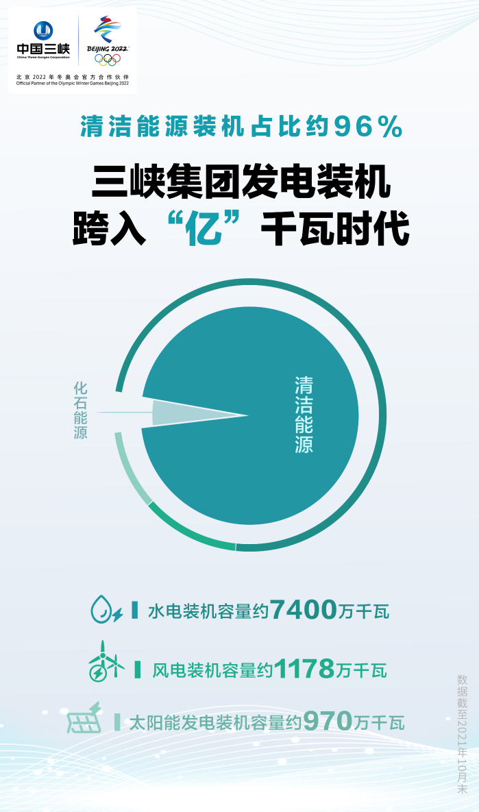 最新數據顯示,三峽集團發電裝機容量已達1.01億千瓦,相當于4.5個三峽電站裝機容量總和。其中,清潔能源裝機容量超過9600萬千瓦,占比約96%,標志著三峽集團向建設世界一流跨國清潔能源集團目標又邁進了一步,為助力國家全面綠色轉型發展、實現“碳達峰、碳中和”目標提供有力支撐保障。