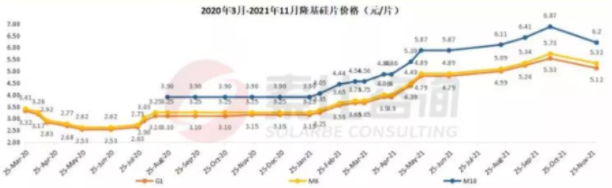 對標11月的硅片價格,中環的G1硅片,每片下降0.52元,降幅9.1%;M6硅片下降0.72元,降幅12.48%;G12硅片下降0.55元,降幅6.04%。