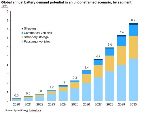 隨著電動汽車銷量大幅上升和儲能電池需求大幅增長,睿咨得能源(Rystad Energy)預計到2030年全球電池需求量可能會接近8.7太瓦時(TWh)。電池循環壽命通常指的是電池容量降至原始容量的80%所需要的時間,這意味著電池的續航里程也下降到了80%。電動汽車電池的設計循環壽命通常與汽車的總體預期壽命 (大約15年)相同,屆時報廢的汽車電池可以被重新用于電網儲能。因此,這些電動汽車電池最終被用于儲能還需要15年的時間。然而,可以合理地假設,未來電網儲能電池需求的很大一部分將通過使用改裝的電動汽車電池來滿足。將這兩種電池需求結合起來意味著,未來這兩個行業將需要大約20太瓦時的新電池。根據睿咨得能源(Rystad Energy)的中期預測,預計到2030年全球電池需求量將接近8.7太瓦時。乘用車將占大部分需求,其次是儲能、商用車和航運。
