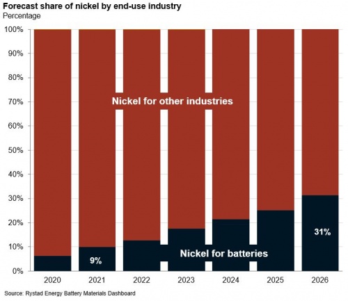 睿咨得能源(Rystad Energy)預計,不銹鋼行業對鎳金屬的需求將以每年約5%的速度增長,而電池用鎳需求將呈現爆炸式增長。在不受供應限制的情景下,到2030年電池可能需要超過100萬噸鎳金屬。