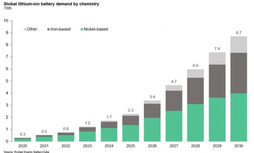 睿咨得能源預計,到2030年,高鎳電池將占據最大的市場份額,略高于高鐵電池,而其他解決方案將遠遠落后于這兩種電池類型。但鎳供應短缺可能會影響這一預測,因為動力電池行業可能不得不與鋼鐵等其他行業爭奪鎳供應。