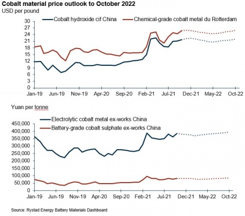 由于交易更加活躍,歐洲鈷價也有所上漲。2021年10月,化工級金屬鈷鹿特丹交貨價約為25.80美元/磅(見圖3),較上月上漲5.7%。