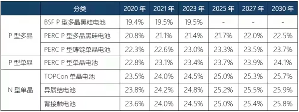 P型電池主要有BSF電池和PERC電池兩種,2015年之前,BSF電池占了總市場的90%,是絕對的主流。2016年之后,PERC電池接棒起跑,到2020年,PERC電池在全球市場中的占比已經超過85%,BSF電池淘汰出局。在此期間,電池轉換效率從不足20%提升到超過23%。