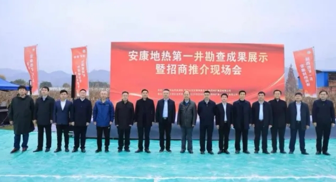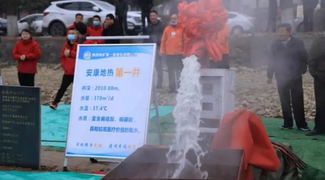 2021年12月14日,陜西省安康市第一口地?zé)峋诤憧谑痉秴^(qū)高儉村出水,井深2010.88m,井口水溫37.4℃,24小時穩(wěn)定流量370m/d。這是安康市礦產(chǎn)資源開發(fā)的重大喜訊和重大突破。安康市自然資源局和恒口示范區(qū)管委會聯(lián)合舉行勘查成果發(fā)布會。