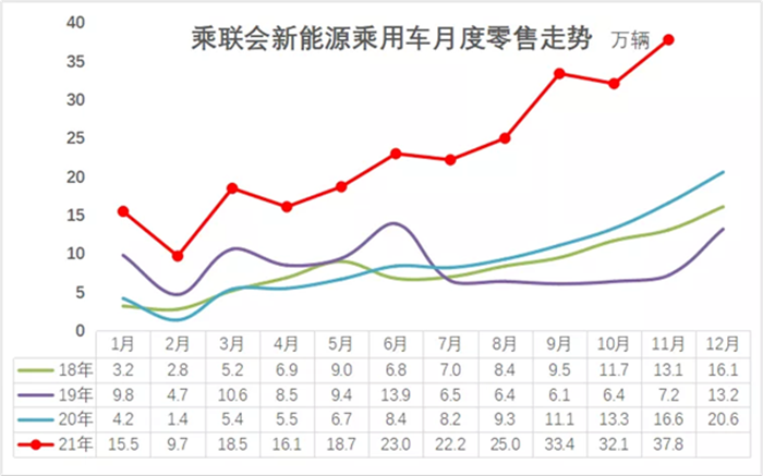 根據乘聯會數據,今年11月,新能源乘用車零售銷量為37.8萬輛,滲透率達到20.6%。1-11月的滲透率為13.9%,較2020年的5.8%提升8.1個百分點。