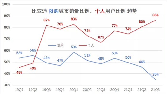 此外,DM-i省油、低價、沒有充電焦慮的優勢,適合中小城市,因此秦PLUS DM-i的上市還推動了比亞迪在非限牌城市的滲透——從限購城市銷售占比看,今年Q2之前,比亞迪一直處在50%左右的水平,銷量對限購城市還有一定的依賴。今年Q3,隨著DM-i車型的銷量攀升,限購城市占比快速下降到35%。