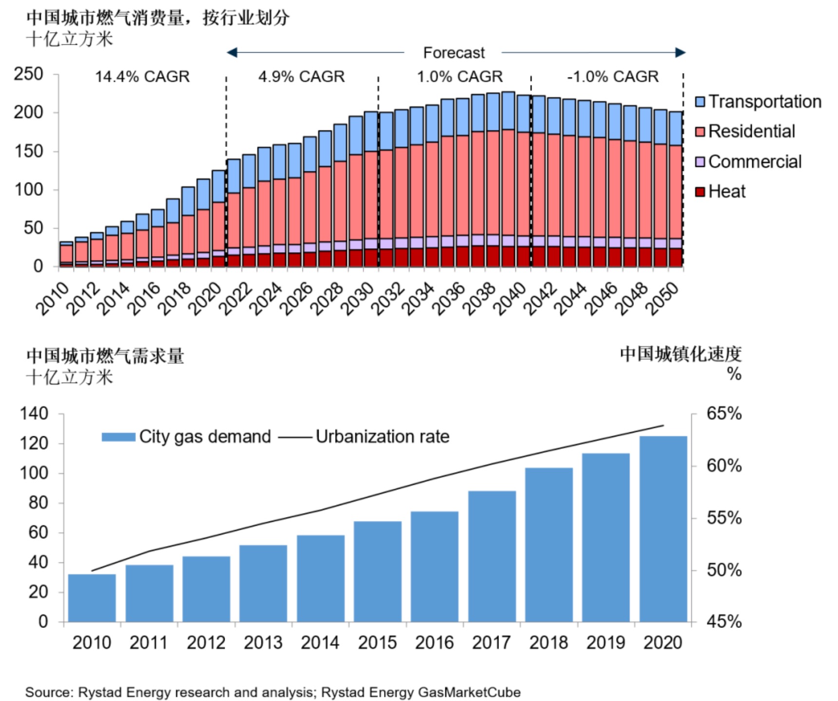 睿咨得能源(Rystad Energy)預計,本十年,城市燃氣將繼續推動中國天然氣需求增長,預計城市燃氣需求年均復合增長率為4.9%,2030年達到2020億立方米,主要收到居民生活用氣的支撐。在2030-2040年,隨著居民生活領域 “煤改氣” 趨于飽和以及中國城市的能源結構日益電氣化,預計屆時城市燃氣需求年均復合增長率將放緩至1%。