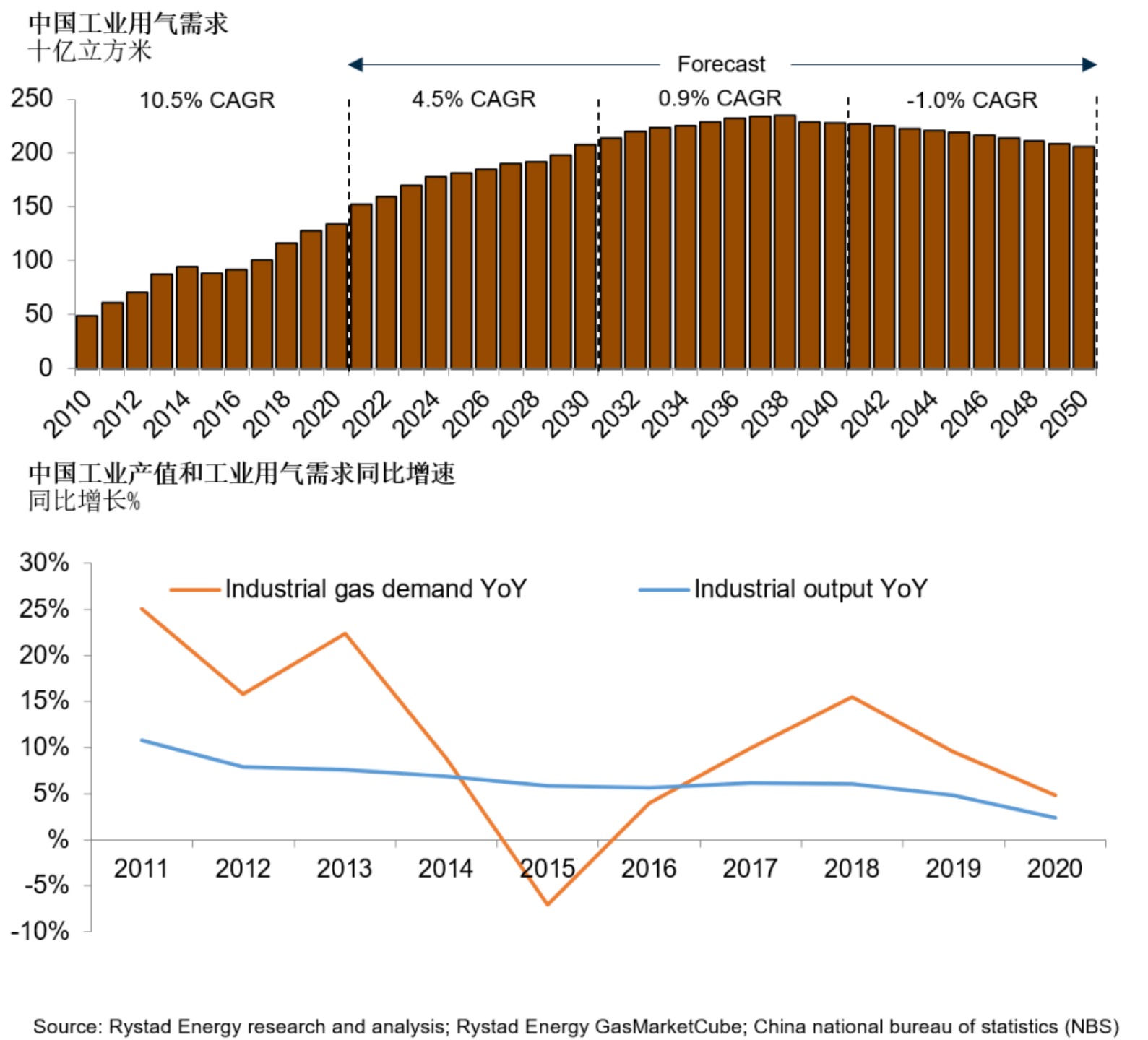 由于政府持續推進供給側結構性改革,淘汰過剩產能以及控制工業生產中的能源消耗,近幾年中國工業產值增速已經放緩。這使工業用氣同比增速從2010年代初的兩位數降至2020年的4.8%,2020年工業用氣也因疫情受到抑制。