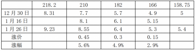 1月26日,中環(huán)股份發(fā)布P型單晶硅片最新價格公示。與1月16日報價相比,各尺寸硅片價格均有一定幅度上漲。以160μm厚度為例,具體見下表: